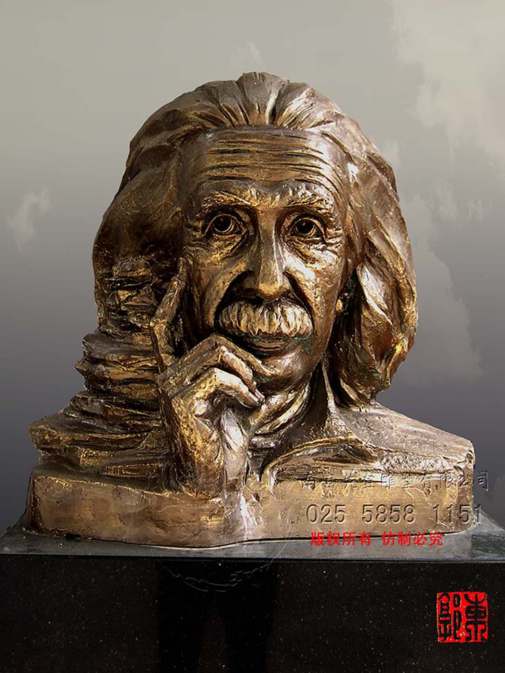 雕塑作品是雕塑家個人內(nèi)心的情感和表達欲望情感的載體、宣揚精神層面的介質(zhì)。愛因斯坦的雕塑塑造的是智慧與仁義的結(jié)合,他的人生在不斷探索、思考中感染著人類。藝術(shù)家索取的就是愛因斯坦散發(fā)出的人格魅力,他是世界的公民,他的愛建立在人道主義情懷之上,不屬于哪一個國度,藝術(shù)家無需精雕細(xì)琢,不是色彩的感覺,是內(nèi)蘊情感的流露,猶如匕首刺向偽君子的面具,真實的面對生活,從事嚴(yán)謹(jǐn)?shù)目茖W(xué)研究。那是什么樣的文化孕育出世紀(jì)的偉人,是什么樣的審美心理塑造出的永恒。