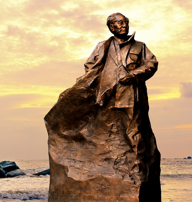 “愈益完美”是在雕塑的情動(dòng)之美里展現(xiàn)出來(lái),雕塑塑造的并不是個(gè)暗啞的人,而是有內(nèi)中情動(dòng),用一種人類崇高的方式表達(dá)出來(lái),你可以理解無(wú)聲,但卻掩蓋不了洶涌在作品下,洶涌在大陳島開拓者內(nèi)心的情動(dòng),這與雕塑是暗合的,與大陳島亦是暗合。雕塑用“蒙太奇”的手段,將不同的的人物在不同的時(shí)間段活動(dòng)表達(dá)銜接。如電影片段,第一尊“墾拓”雕塑是塑以群雕的形式,有人拾起鐵鍬,有人舉起木夯,還有一人喂哺羊羔,眾人都是不遺余力開拓這片疆域。如同雕塑中塑造的旗幟,迎風(fēng)鼓動(dòng),獵獵作響。旗幟的安插,是一種肯定、一種精神的導(dǎo)引,那一群開拓者如同將士,將士只有在一片不毛之地墾拓,而并非在開拓好了的疆域里征戰(zhàn)。大陳島的開發(fā)便也是如此,城市市場(chǎng)飽和,人類情感飽和的狀態(tài)下,大陳島的開發(fā)是勢(shì)之趨,大陳島的未來(lái)便也如下面的雕塑,是一種觀望,如第二尊“觀望”雕塑,以山體為型,然卻在這之中的變化間,塑造了一尊老人的面容,他在眺望,眼神深邃堅(jiān)定,內(nèi)中透有濃濃的情感,似在望那遲歸的捕魚人,而老人旁邊同樣鑄造一個(gè)小男孩,他在看,他海的那邊會(huì)是什么,看海上升騰起的紅日,看歸來(lái)的父母。對(duì)美好事物的信仰,這片土地,寄托的是開拓者的信仰,他們堅(jiān)信,在努力之下必定結(jié)出碩果,而那第三尊“濠濮間想”雕塑便是他們眼中的美好,他們未來(lái)生活的境遇會(huì)是這樣一幅諧和的畫面,一妙齡少女坐在海邊礁石上,有海鷗逐浪翻涌,人物與自然界相擁,物我相忘。
